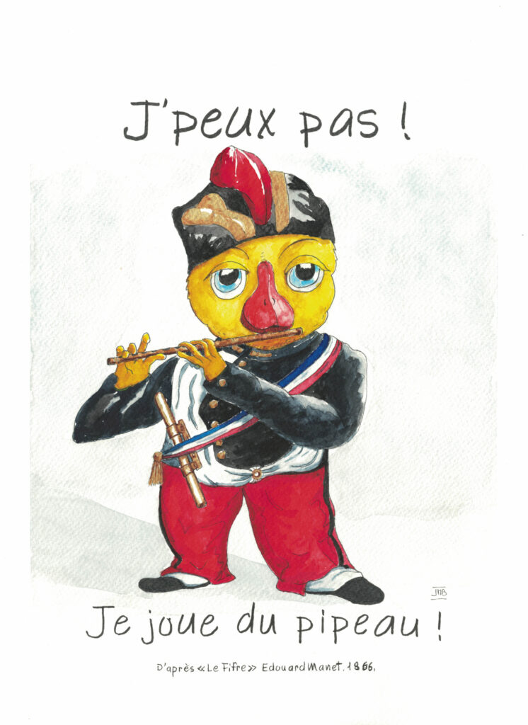 2- « Le Fifre » est un tableau réalisé par Édouard Manet en 1866, et resté célèbre en raison de ses couleurs vives et contrastées. Le personnage est vêtu de l’uniforme des enfants de troupe de la garde impériale de Napoléon III. Le pantalon rouge à bandes noires, la veste noire à boutons dorés, le baudrier blanc et le calot sont caractéristiques des voltigeurs.